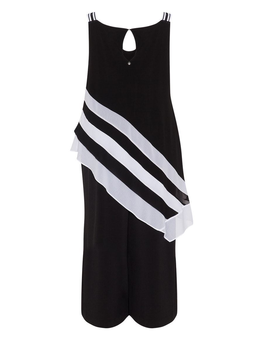 Die elastischen Eigenschaften des Jerseys und der gerade und mäßig lockere Schnitt sorgen für Tragekomfort und eine gute Passform, während der Chiffon-Überwurf Ihren weiblichen Kurven schmeichelt. Die Träger und der Rundhalsausschnitt lassen den Blick auf Ihre Schultern zu.