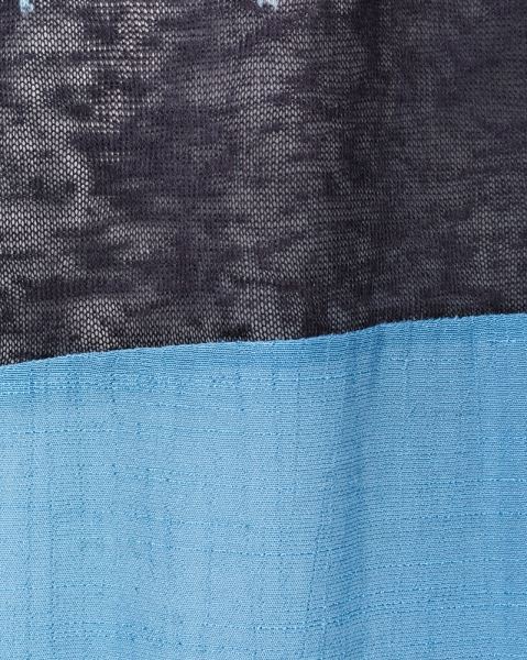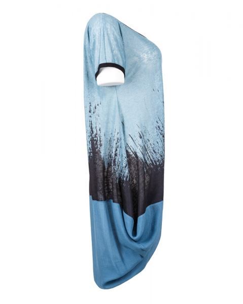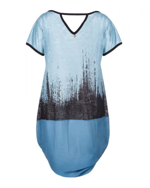 Diese spezielle Tunika ist eine Kombination aus feiem Strick und glänzendem Stoff. Nach unten ist die Tunika zuerst weit geschnitten und schliesst dann eng wieder zusammen. V-Ausschnitt im Rücken.