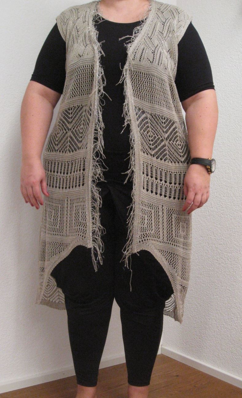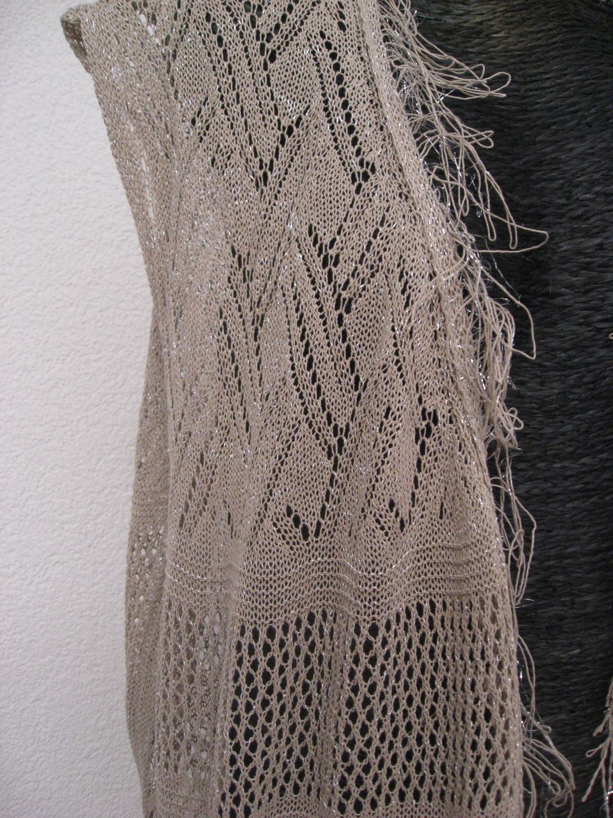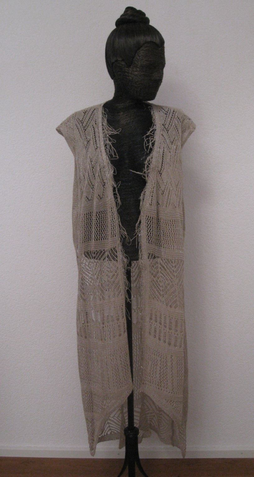 Veste en dentelle crochetée (sans manches) de couleur beige avec fil argenté. Plus long à l'arrière. Petites franges sur les bordures à l'avant.