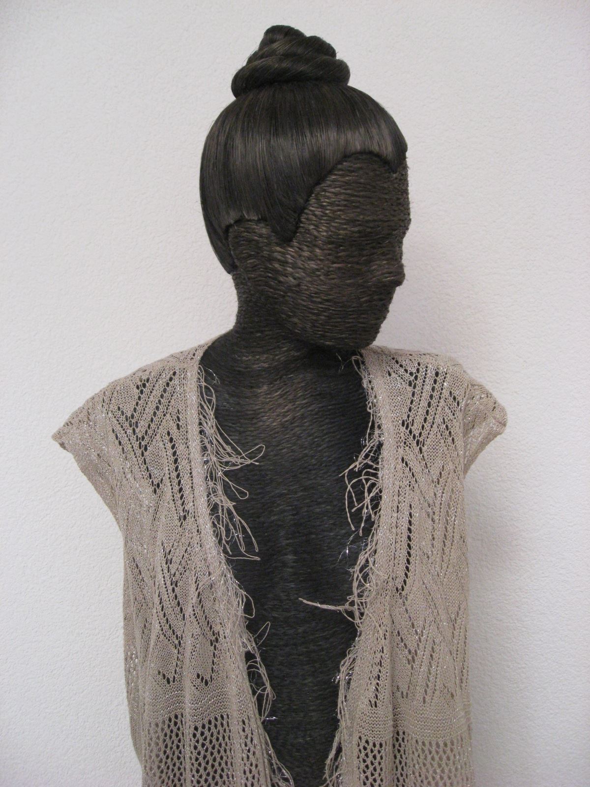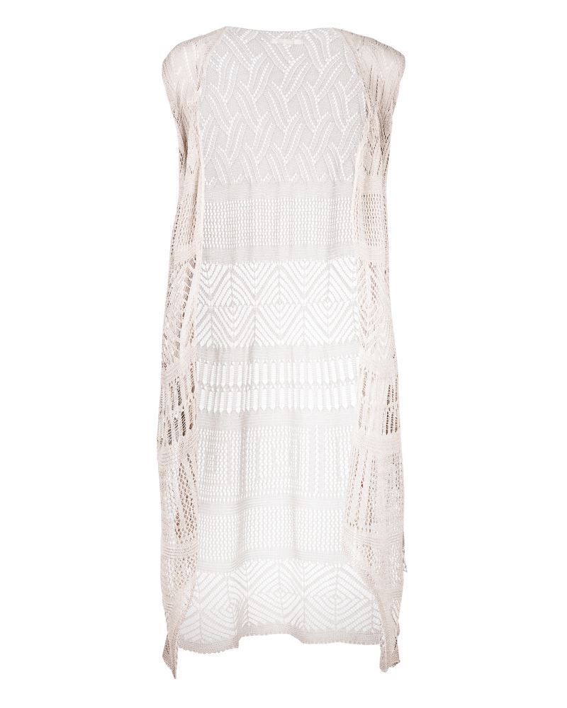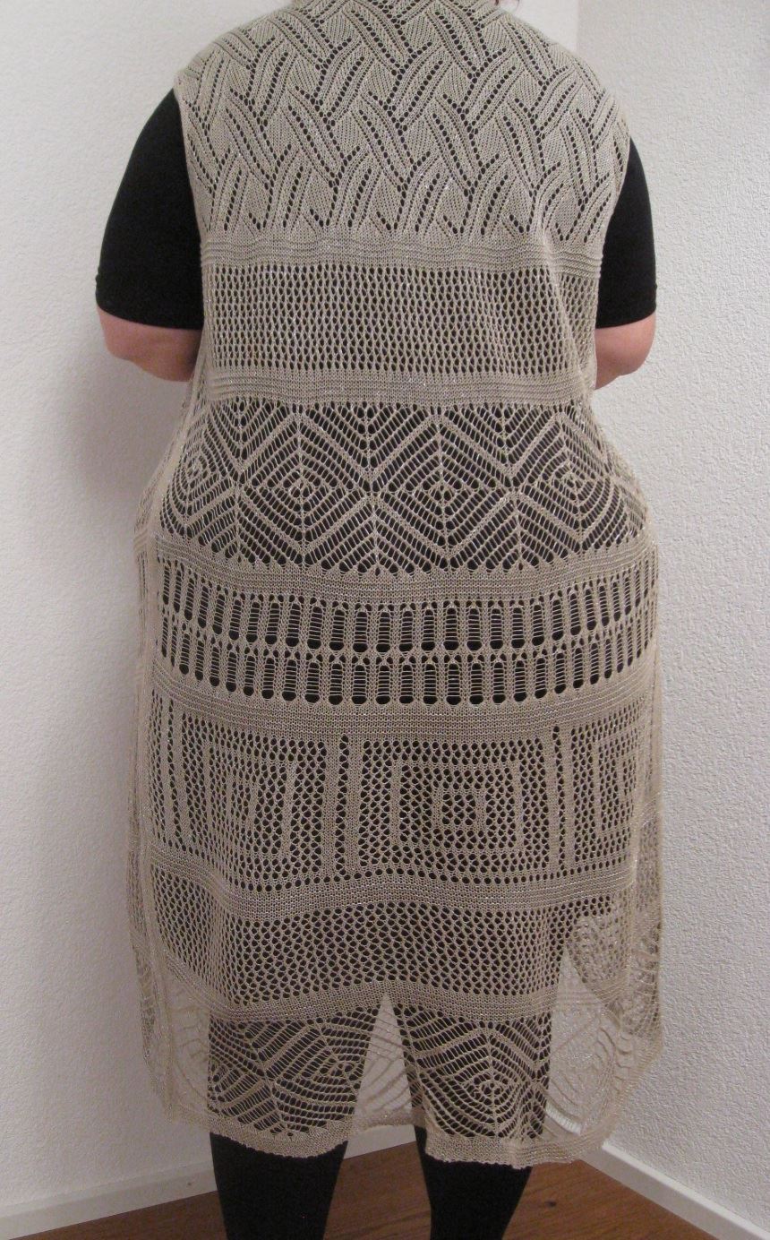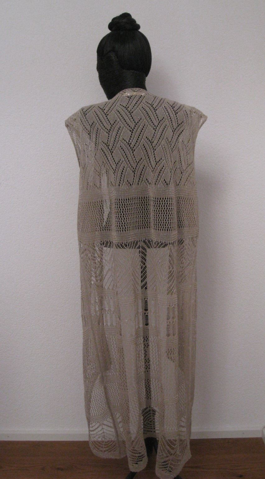 Veste en dentelle crochetée (sans manches) de couleur beige avec fil argenté. Plus long à l'arrière. Petites franges sur les bordures à l'avant.