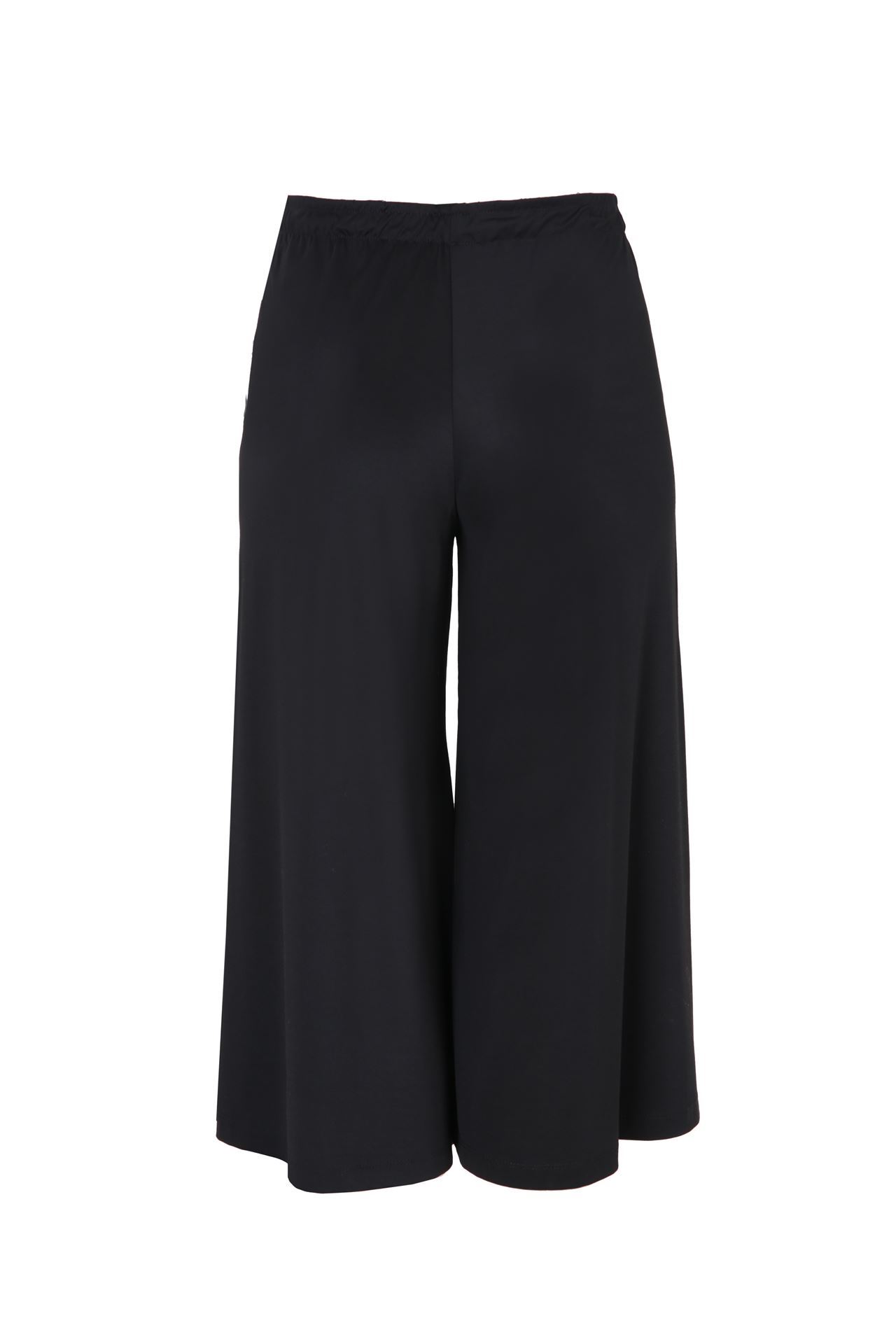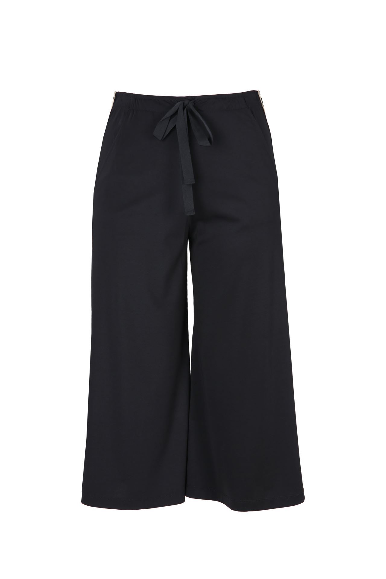 Pantalon large 3/4 noir avec rayures latérales scientillantes en argent et or qui retiennent l'attention.