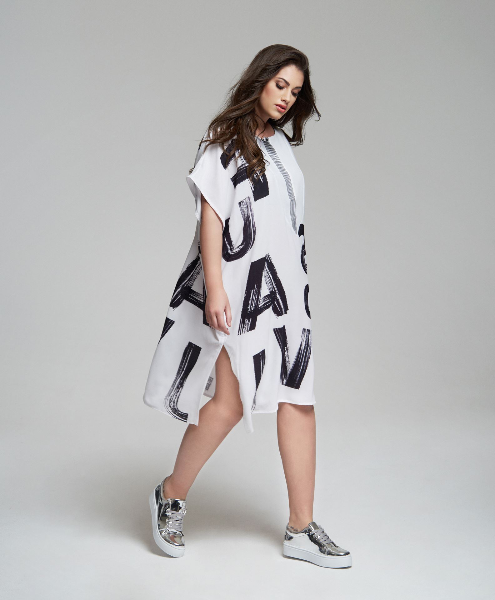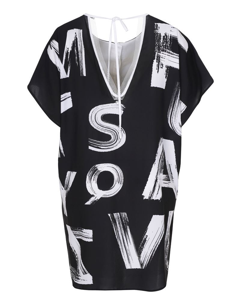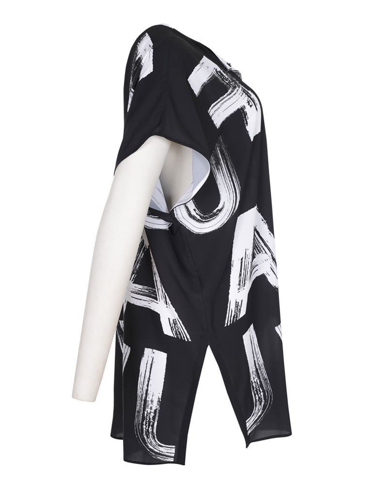 Ce haut long noir se présente sous une forme tout à la fois classique et tendance avec son look bicolore qui adopte un imprimé lettres blanc très sophistiqué. La coupe carrée qui descend jusqu'aux genoux met parfaitement votre silhouette en valeur tandis que les fentes latérales confèrent plus de dynamisme au modèle.