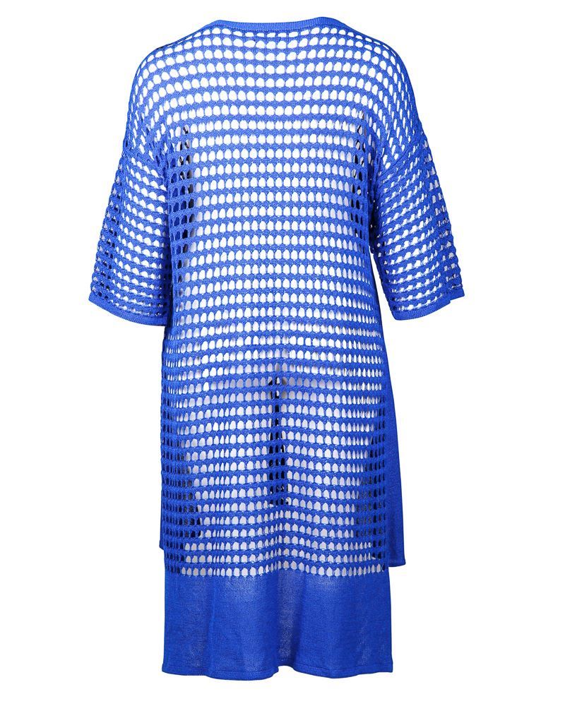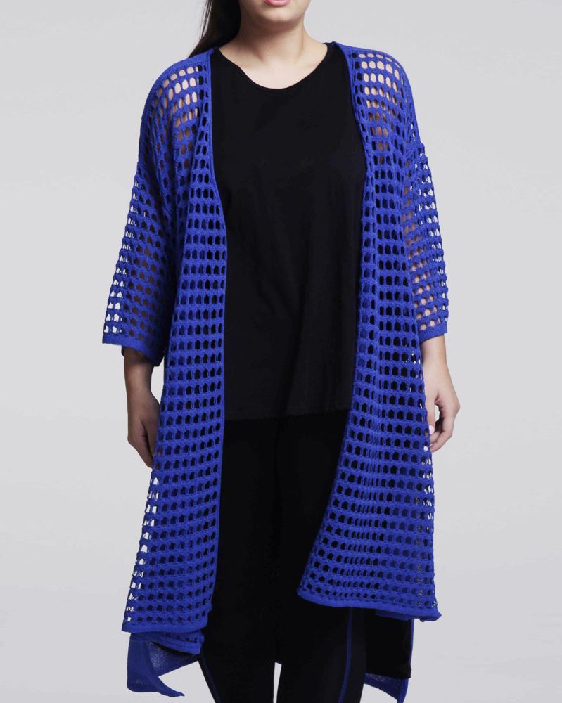 Veste à filet de couleur blanche, noir ou beige. Plus long à l'arrière. Sans boutons.