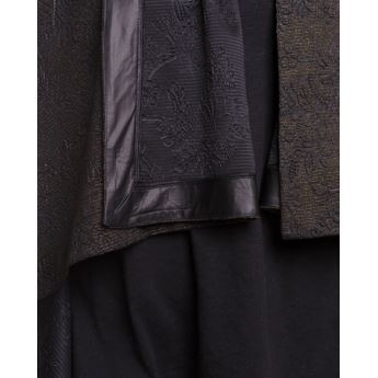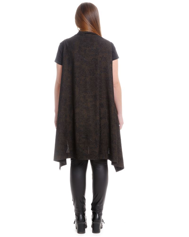Veste asymétrique longue sans manches. Tissu scintillant (fil doré sur fond noir) avec motif floral.