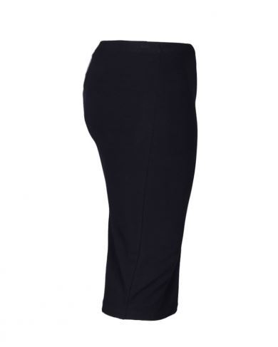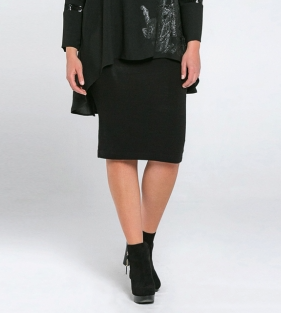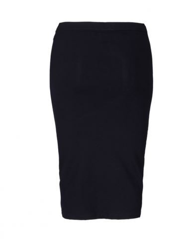 Schwarzer Stretch-Bleistiftrock bis über das Knie.