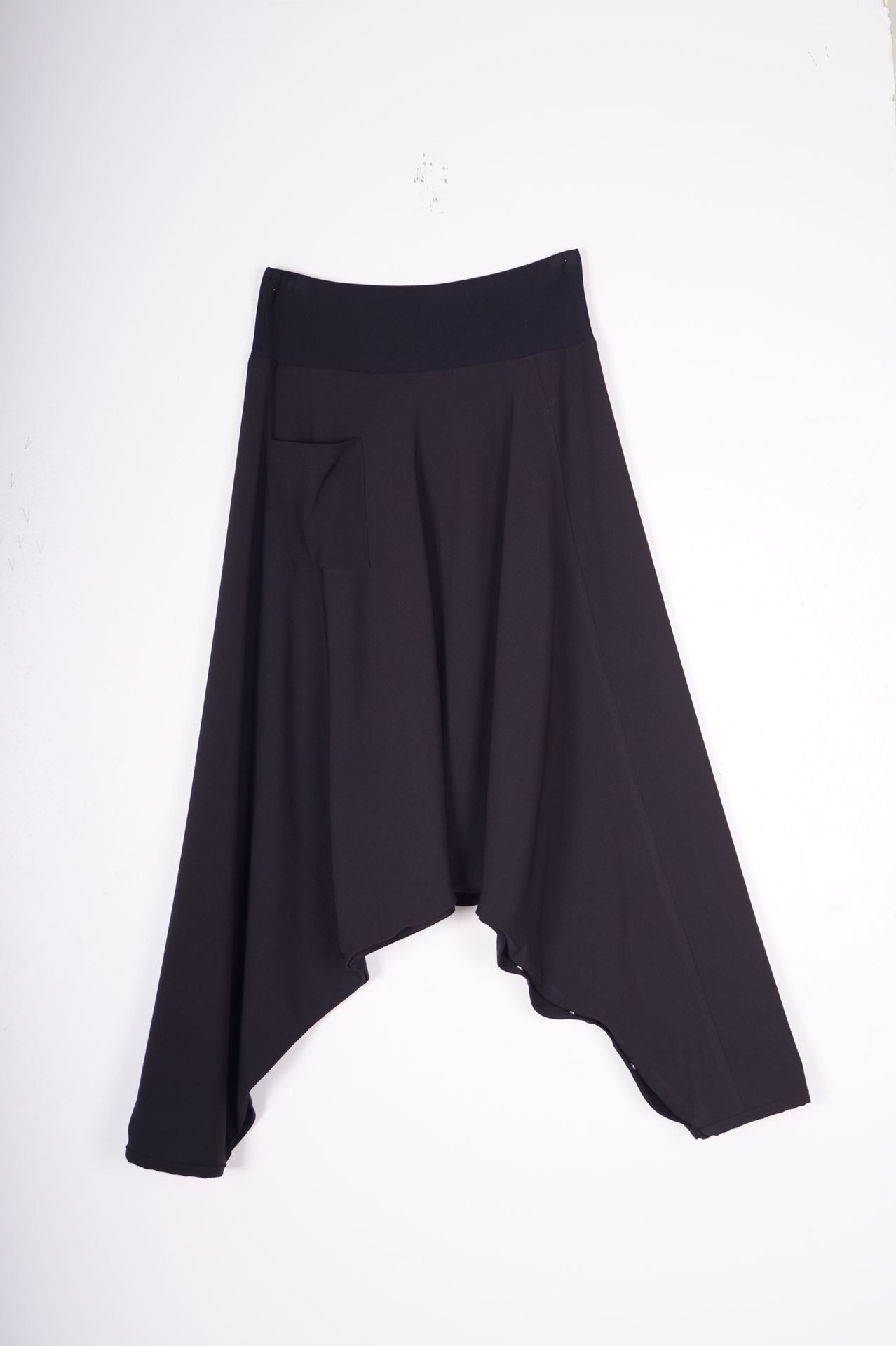 Bequeme und trendige Haremshose aus elegantem Material. Dank Druckknöpfen an der Beininnenseite, kann dieses Teil auch aus asymmetrischer Rock getragen werden.