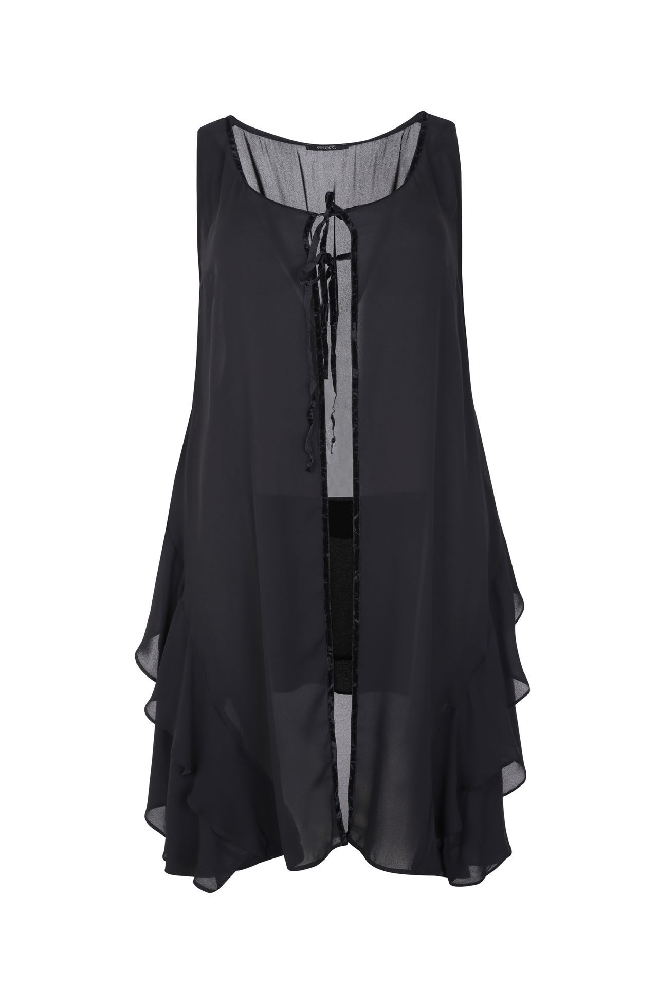 Diese lange Veste aus halbtransparentem Blusenstoff ist ideal über Kleider oder Leggings. Mit den schönen Rüschen zaubert dieser Artikel jeder Frau eine schöne Silhouette.