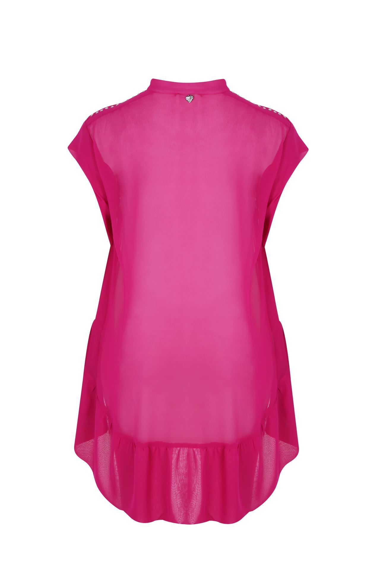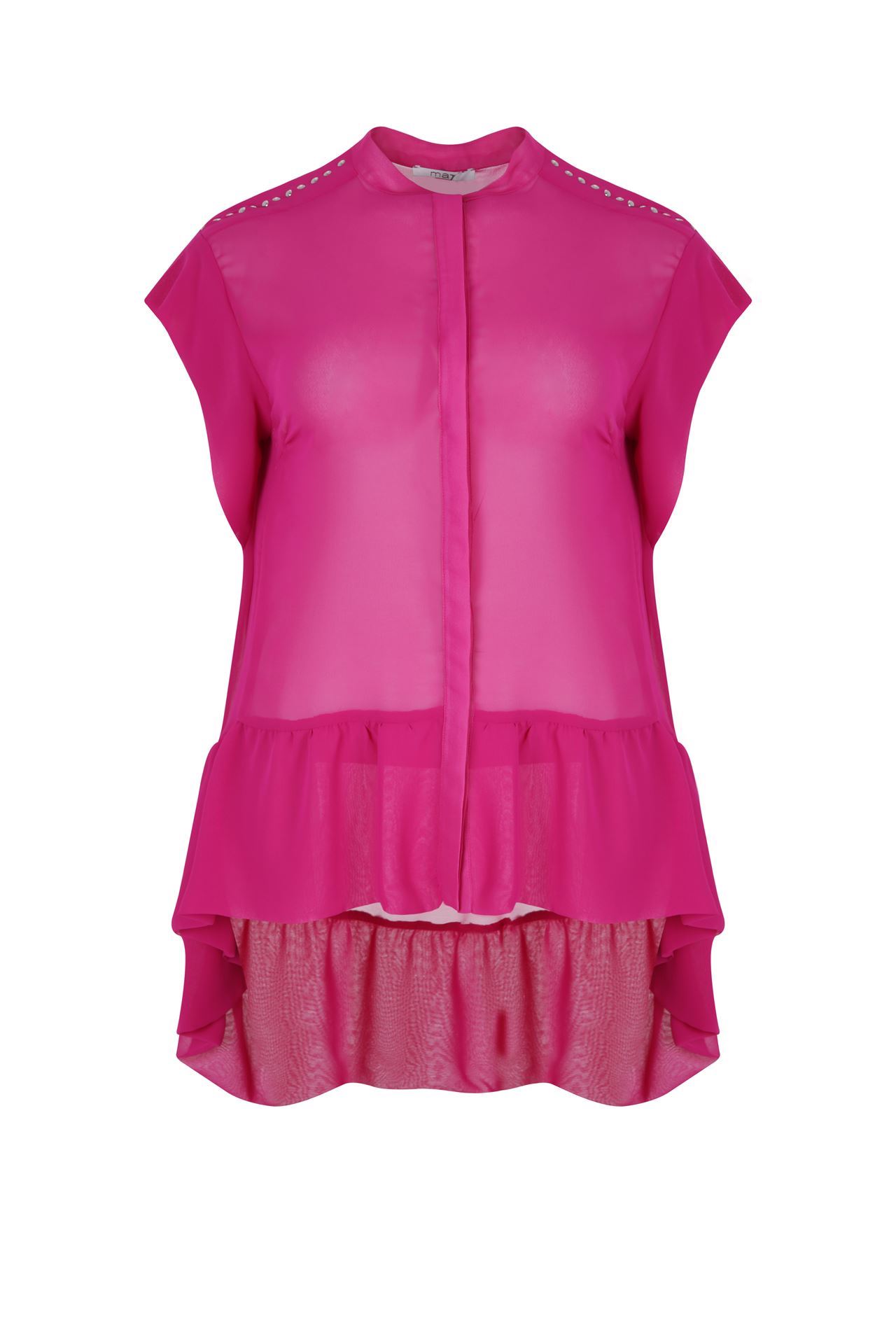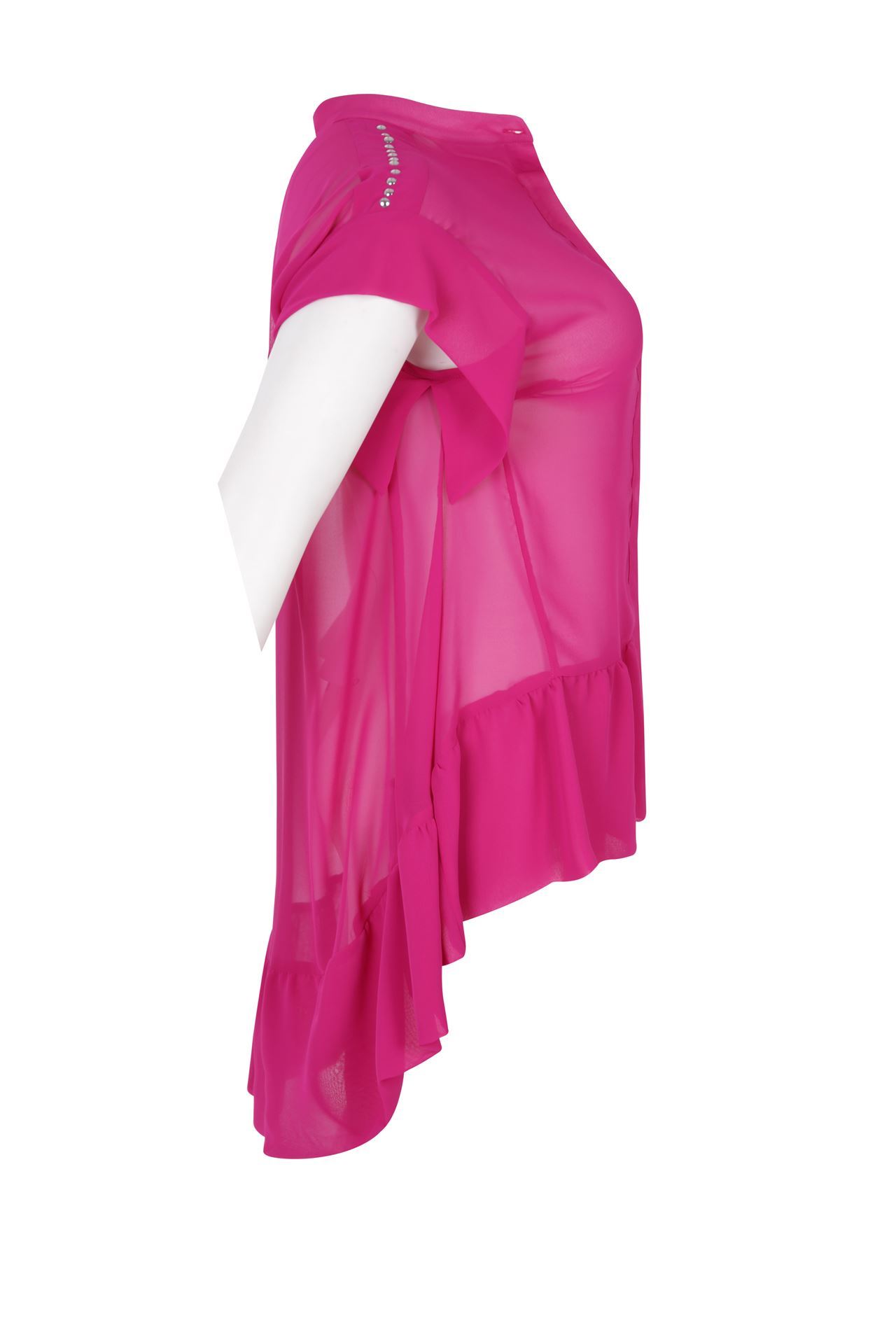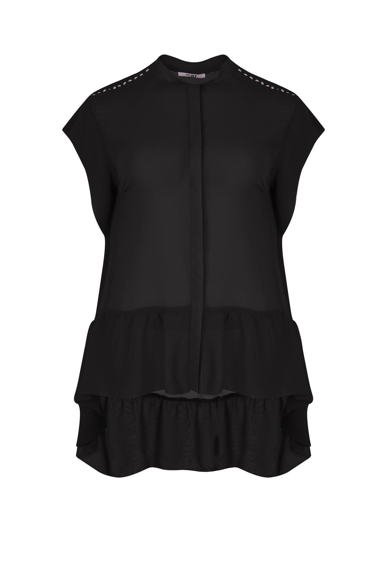 Romantische halbtransparente Bluse mit schöner Deko auf den Schultern und Rüschen am Saum.