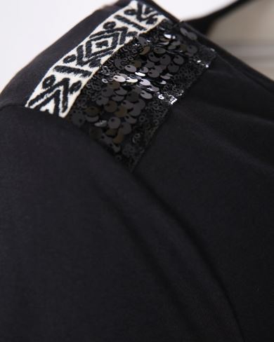 Schwarzes T-Shirt mit V-Ausschnitt und Applikationen auf der Schulternaht.