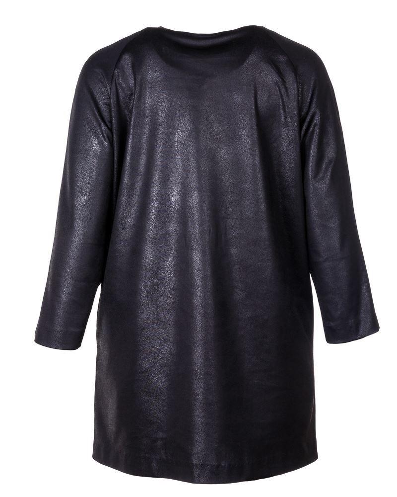 Up close, the glossy, coated finish on this jacket exudes elegance. From far away, the minimalist design and A-line keep things simple, while offering a flattering style.