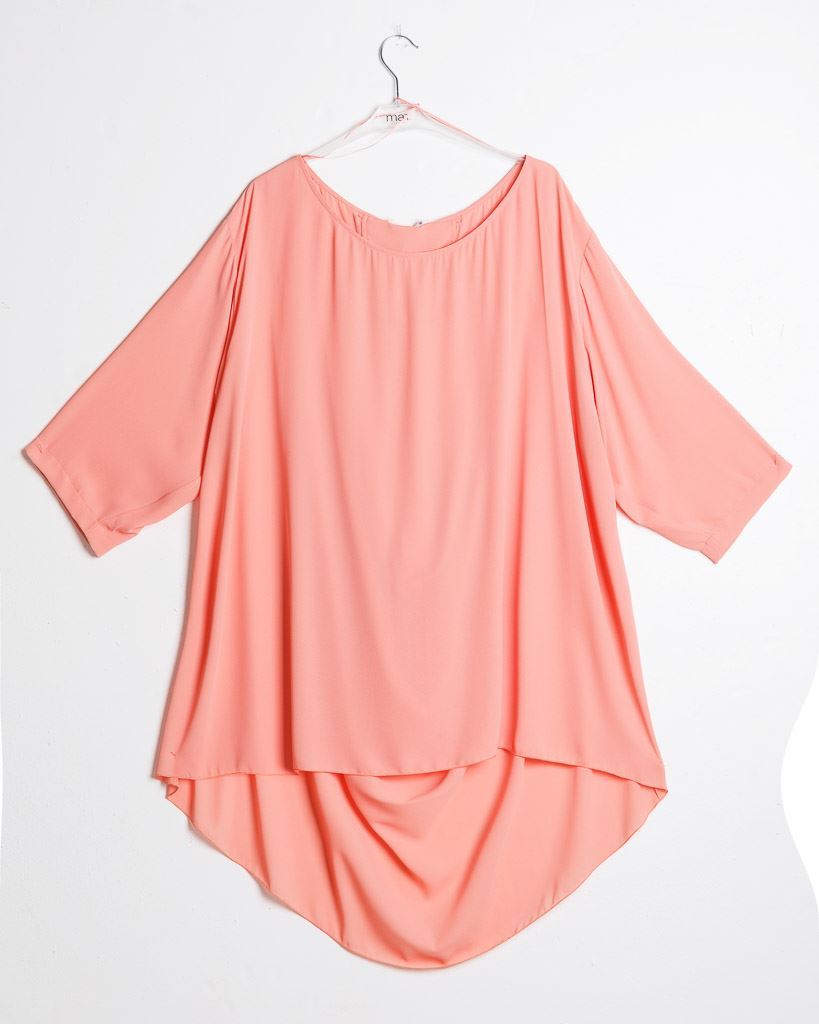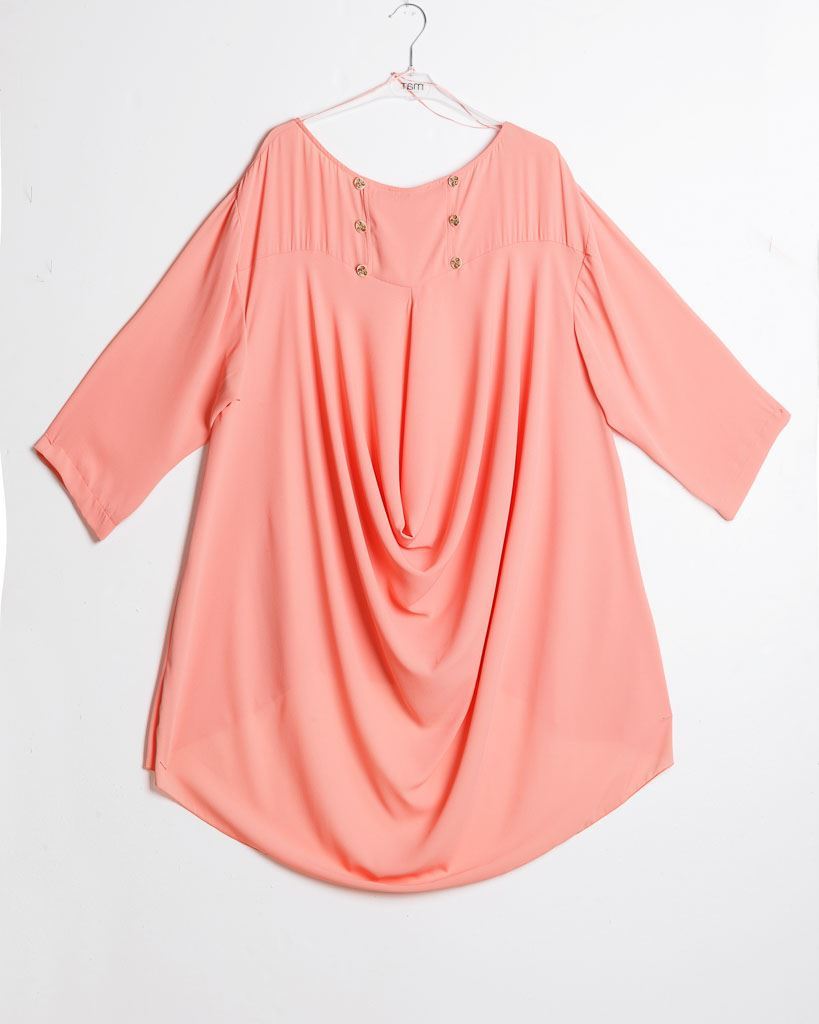 Light-textured monochrome long top in apricot, black or dark blue with pleated decorated back.