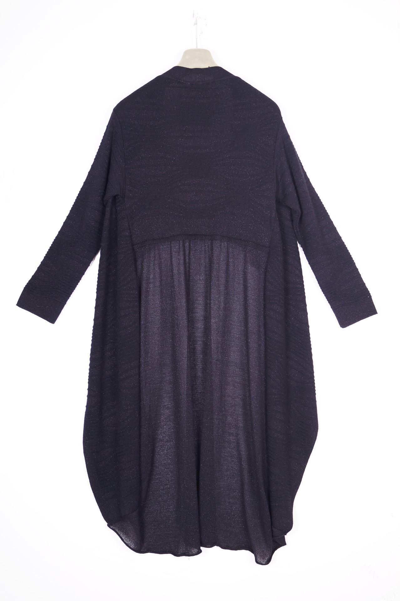 Schöner Feinstrick Cardigan, welcher vorne wie ein Bolero geschnitten ist und kurz ausfällt. Die Hinterseite hingegen ist lang und hat in der Mitte des Rückens eine Naht und darunter Falten. Die Ärmel, die Vorderseite und die obere Hälfte des Rückens hat ein feines Muster. Glänzender Faden.