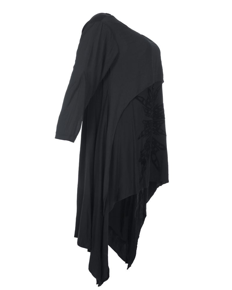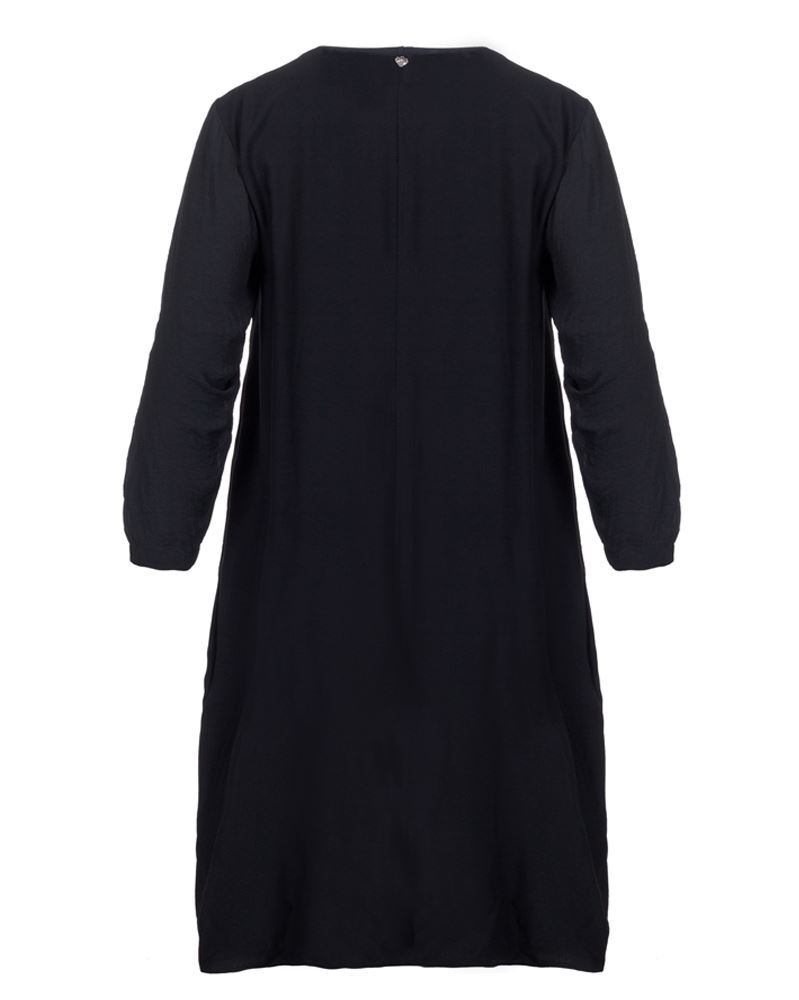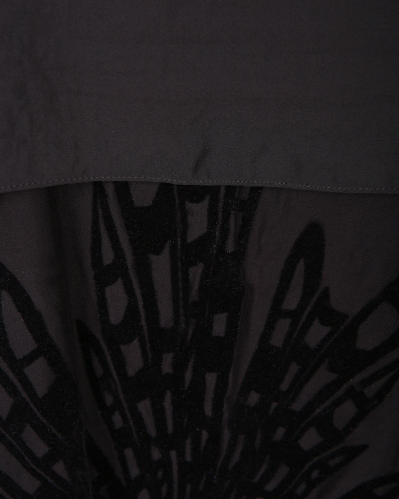 Cette robe midi noir se distingue par un design pimpant double-épaisseur en tissu léger. Un joli imprimé floqué orne le devant de la robe qui ne se fait pourtant remarquer qu'au deuxième coup d'œil. Un double-effet donc.
