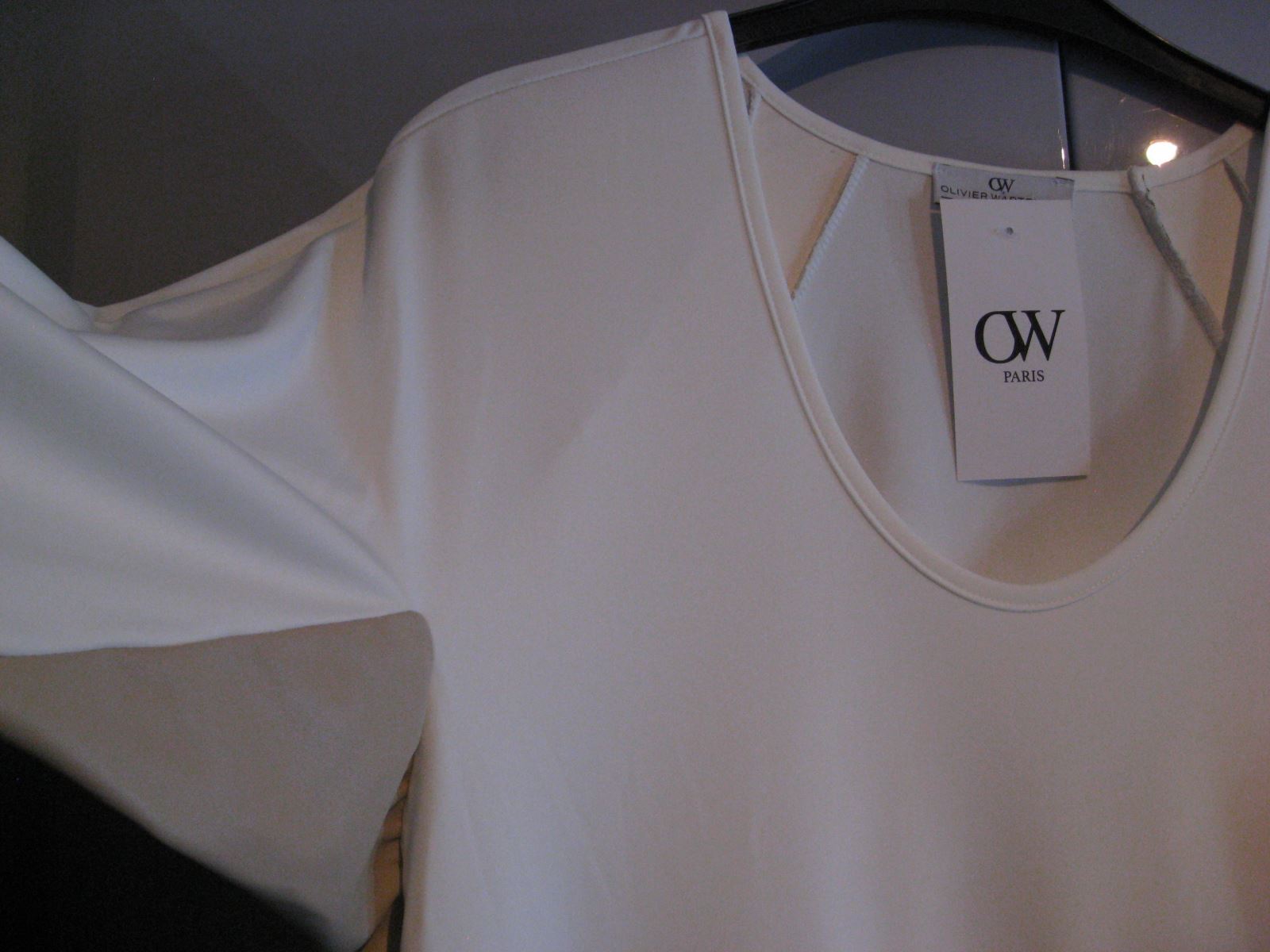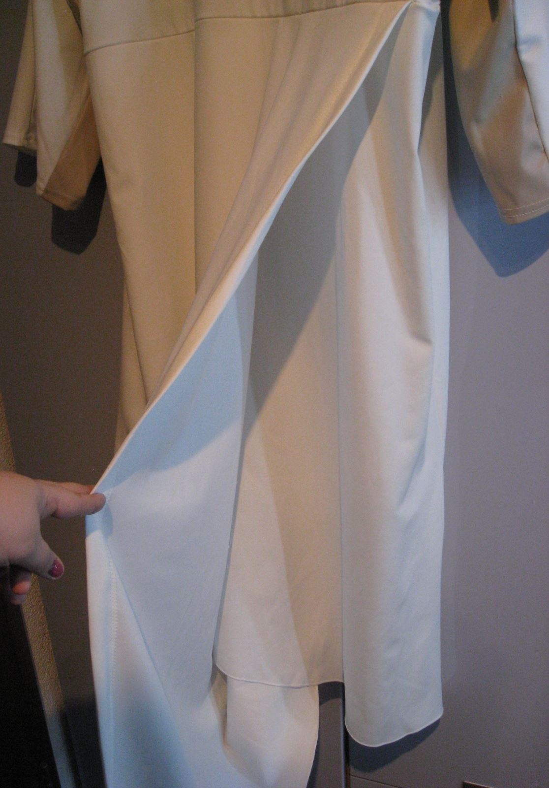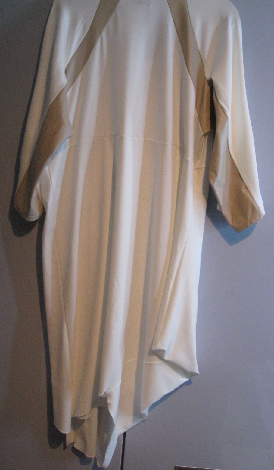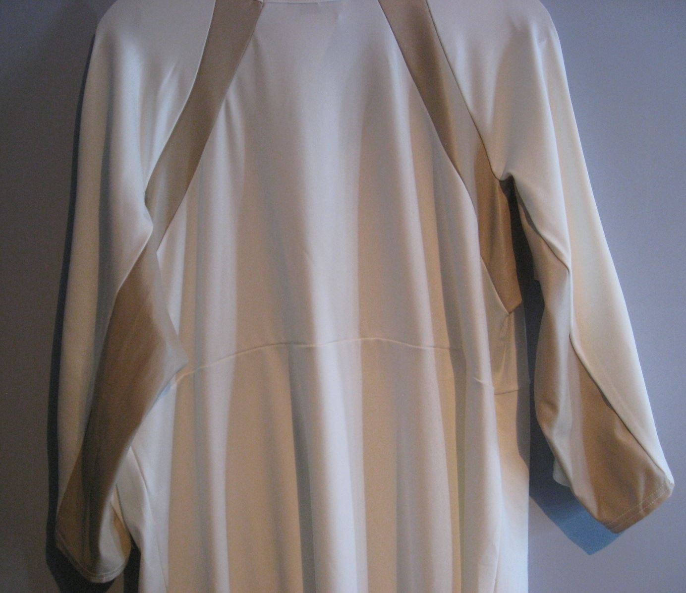 Robe stretch blanche asymétrique avec bandes beiges sous les bras et au dos. Bonne longueur (arrive au-dessous des genoux). Fente sur l'avant.